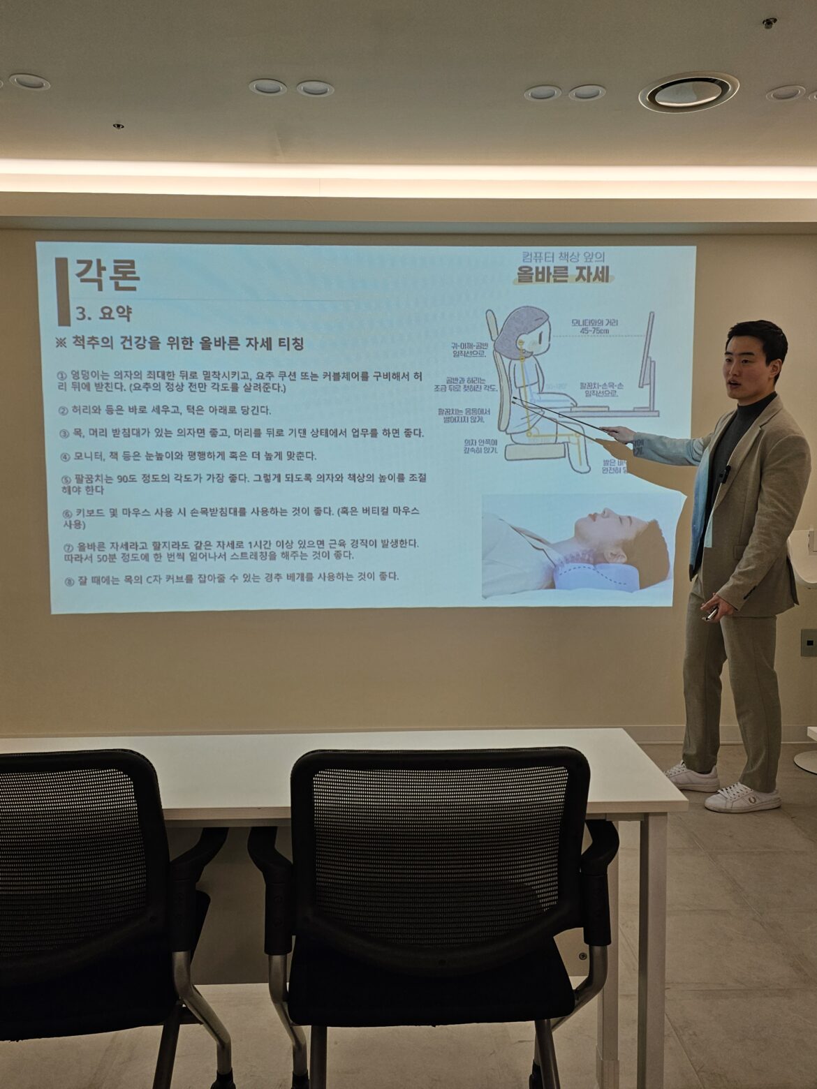 근육의 분류(긴장성, 위상성)에 따라 목, 어깨 및 허리 통증을 구분하여 대처하는 법과 치료에 대한 이야기를 들었습니다. 비의료인 입장에서 듣는 의료상식은 다양했으며, 잘못 알고 있는 내용들도 많았습니다. 무조건적인 근육강화보다는 약한 근육부터 천천히 step by step으로 강화하는 것이 맞다는 것을 알게 되었습니다.