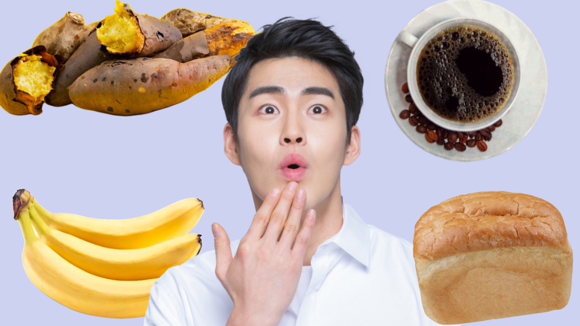 고구마, 커피, 바나나, 빵은 공복에 먹기에는 적합하지 않은 식품입니다.