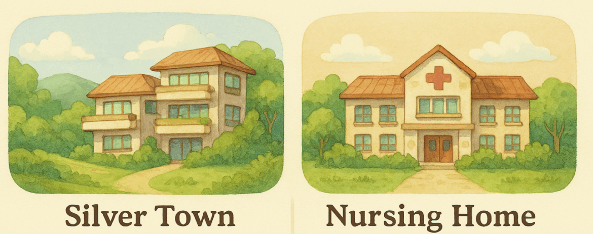 실버타운은 건강한 노인분들을 위한 고급 주거 공간입니다. 단순한 주택이 아니라, 운동 시설이나 문화 공간, 식당 등 다양한 편의시설이 함께 갖춰져 있어 편안하고 여유로운 노후 생활을 누릴 수 있도록 설계돼 있습니다.