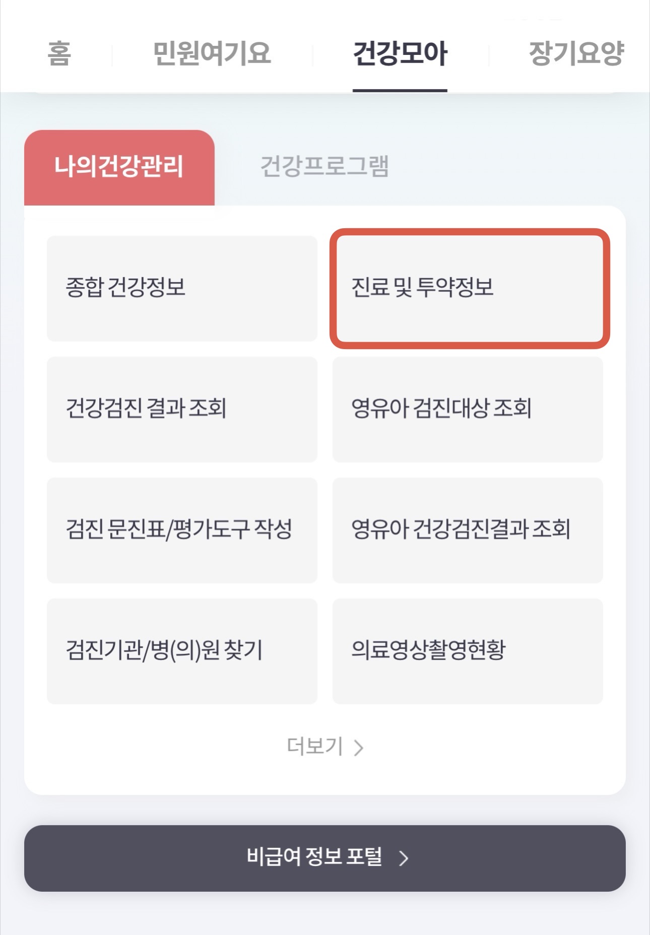 - 하단 메뉴 중 [나의건강관리] 카테고리에 있는 [진료 및 투약정보] 아이콘을 클릭해 주세요.